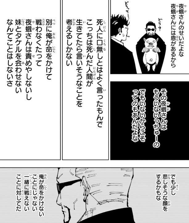 日下部は夜蛾に妹やタケルの件で恩がありますが、その夜蛾も死んでしまい、もういません。しかし日下部は、いないからこそってのもあんだよね、と考えます。夜蛾は自分が命をかけて戦わなくても責めはしないが、少し悲しそうな顔をするかも、と考えます。そして、夜蛾が少し悲しそうな顔をするのも、日下部が命をかけないことにではなく、一緒に戦えないことに対してだと日下部は考えます。