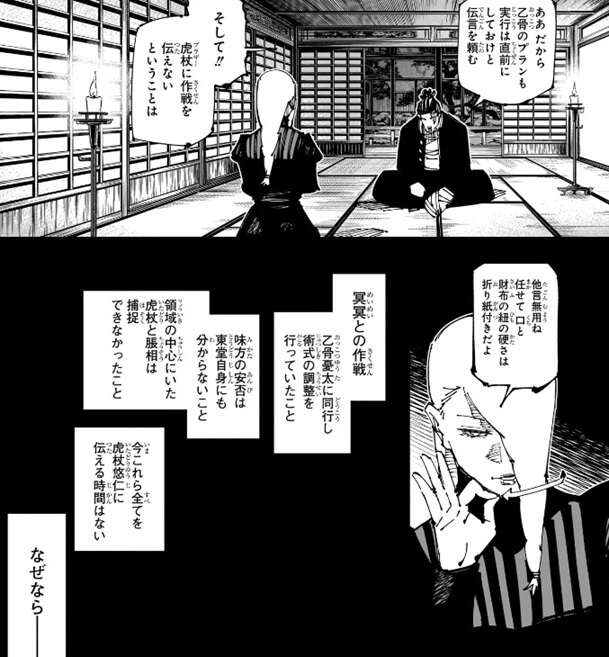 宿儺と虎杖は過去、二心同体だったので、過去形とは言え繋がりが濃いので、共振が起こり虎杖から無意識に宿儺に作戦が漏れる可能性がある、と東堂と冥冥は考えているようです。東堂は、乙骨のプランも実行は直前にしておけと伝言を頼む、と冥冥に伝え、さらに虎杖に作戦を伝えないという事は他言無用で、と冥冥に頼みます。任せて、口と財布の紐の堅さは折り紙付きだよ、と冥冥は答えると、話し合いの場面は終わります。