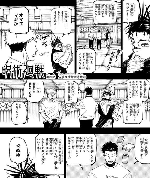 あきれる虎杖ですが、代わりに加茂が赤血操術の基本のイメージを、虎杖に適切に教えてくれます。虎杖にとっては、小便漏らした時みたいな?イメージと捉えたようですが、それでもいいようです。「百歛」に関しても加茂は圧縮する技だからと、スポンジや紙で感覚を養えばいいとアドバイスしてくれます。虎杖に何か教えたい脹相は「超新星」を聞くように言いますが、虎杖にとっては赤血操術は付け焼き刃だから、簡単な止血や縫合の仕方を教えた方がいいと加茂に言われて、ぐぬぬ、と脹相は悔しがります。