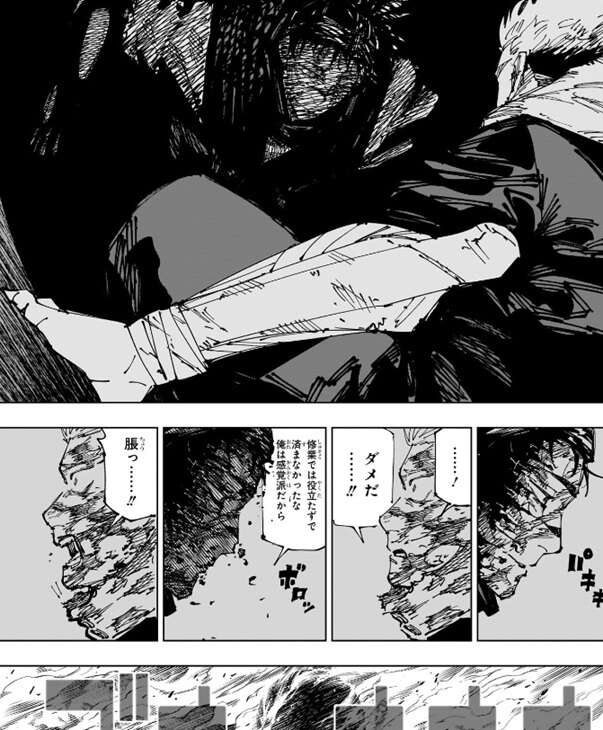 対五条戦で「竈」の炎の術式を使用しなかった理由は、領域合戦で宿儺は結界術の要件変更を重ねた事と、効果範囲を絞り続けた事で、十分な威力が発揮できないとして「竈」は封印していたそうです。虎杖と脹相は「竈」の炎に巻き込まれましたが、脹相が体を張って虎杖を守っています。脹相が赤血操術で血の壁のようなものを作ったのか、二人は脹相が作った壁の中にいます。しかし、脹相は「竈」の炎のダメージをくらい続けているせいか、体がどんどんボロボロになっていきます。脹相は、修行では役立たずで済まなかったな、と虎杖に謝り、俺は感覚派だからと脹相は言い訳します。虎杖はボロボロになっていく脹相を見ながら、感覚派ってよく言いすぎだろう、とつぶやきます。