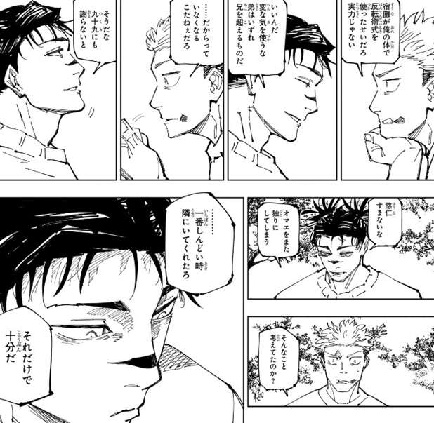 脹相や壊相、血塗、呪胎九相図、虎杖がテーブルを囲んでいた場所へと場面は移りますが、今回は脹相と虎杖しかいません。虎杖はいなくなることはないのにと脹相に言うと、そうだな九十九にも謝らないと、と脹相は答えます。そして、オマエをまた独りにしてしまう、と脹相は虎杖に謝ります。しかし虎杖は、そんなこと考えていたのか?……一番しんどい時隣にいてくれたろ、それだけで十分だ、と脹相に言います。これは虎杖が渋谷事変後で辛い時や、東京で呪霊狩りをしていた時の事を言っているのだと思います。この間、脹相は虎杖に常に寄り添っていたはずなので。