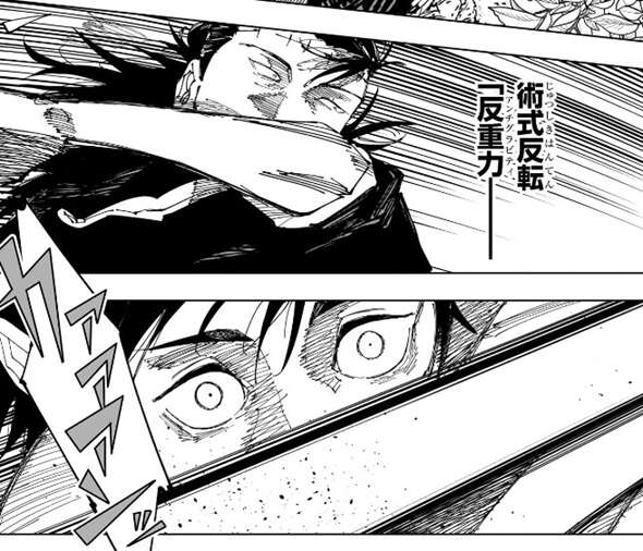 虎杖はそのまま宿儺にパンチを放ち、このパンチは黒閃となります。本日、虎杖にとって通算9度目の黒閃がきまります。