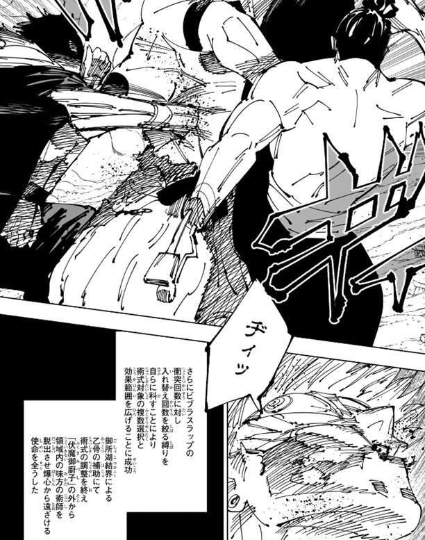 入れ替わりが止まったと判断した宿儺は虎杖にパンチを浴びせようとしますが、さらに東堂がビブラスラップを鳴らして入れ替わりを発生させ、入れ替わりに合わせて虎杖はパンチを、東堂は蹴りを宿儺に浴びせます。「不義遊戯」改は、ビブラスラップの衝突回数に対し入れ替わり回数を絞る縛りを東堂自らに科すことで、術式対象の複数選択と効果範囲を広げる事に成功しているようです。御所湖結界(コロニー)で乙骨の補助にて、東堂は術式「不義遊戯」改の調整を終えていて、東堂は「不義遊戯」改を使用することで、「伏魔御廚子」の外から領域内の味方の術師を脱出させ爆心から遠ざける使命を全うしました。