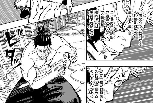 虎杖と東堂は「不義遊戯」改で、戦いを有利に進めていきます。一方、宿儺は一度のタップに対する入れ替え回数の最大値と最小値を東堂に好きに調整されてしまい、ここを好きに調整できるとなると「不義遊戯」に慣れるのは実質不可能だと感じていました。しかし、一度だけ確実に入れ替えを読めるタイミングがある、と宿儺は確信していました。