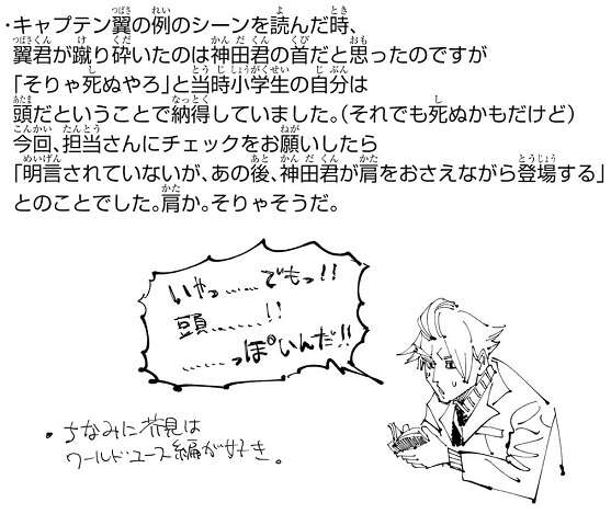 キャプテン翼の例のシーン、作者の芥見下々先生は翼が神田の首を蹴り砕いた、と最初は思っていたそうです。ただ、それだと死ぬので、頭を蹴ったと納得していたそうですが、担当からは、肩を抑えながら登場する、と言われて、肩か、そりゃそうだ、と今回納得したそうです。しかしそれでも、頭……!!……っぽいんだ、と芥見下々先生は思っているようです。