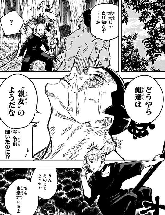 東堂葵から女のタイプを聞かれ、虎杖は正直に、尻(ケツ)と身長(タッパ)がデカイ女の子…、と答えます。すると、偶然東堂と同じ女のタイプだったことから、東堂は存在しない記憶を持つほどに虎杖の事を“親友”と認識するようになります。その後、虎杖は京都校の生徒達に襲われますが、東堂は虎杖を自分の術式を使って助けます。