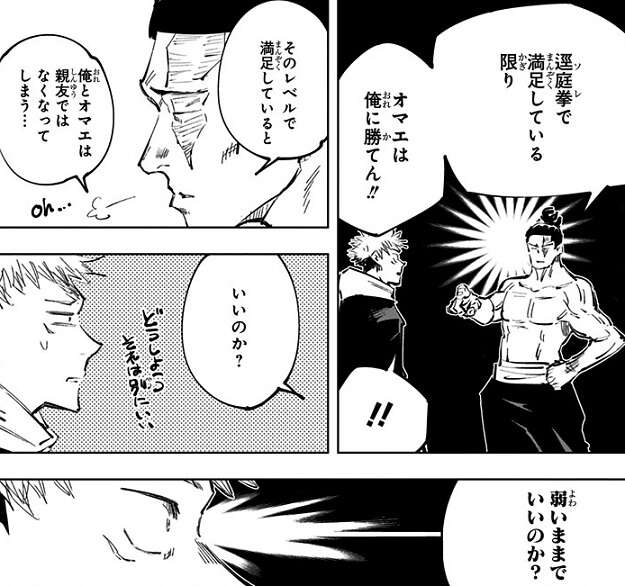 東堂と東京校妨害によって虎杖の暗殺は失敗となり、虎杖と東堂はあらためて手加減なしの対決をします。東堂は虎杖のパワーやタフネスを絶賛しますが、時間差で呪力がぶつかってくる逕庭拳にはダメ出しをします。虎杖は東堂から、逕庭拳に満足している限り、オマエは俺に勝てん!!と、はっきりと言われてしまい、東堂の指導を受けることになります。