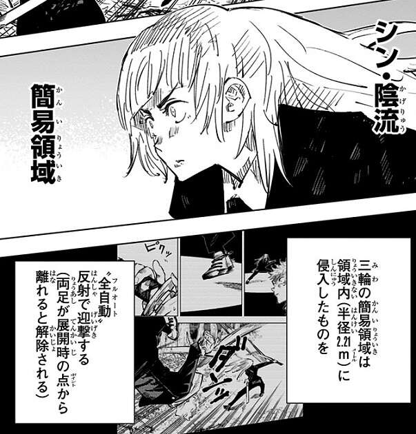 以前真依から、真希は呪いも見えない呪具振り回すだけの一般人、万年4級、と聞いていて安心していましたが、実際に真希と対決し、真希が無茶苦茶強いことに驚き、嘘を教えた真依を恨みます。シン・陰流 簡易領域で何とか真希の隙を作ろうとしますが、真希には隙を作ろうとしている事を見抜かれてしまい、折った大刀と暗器を投げつけられ、間合いを詰められてしまいます。