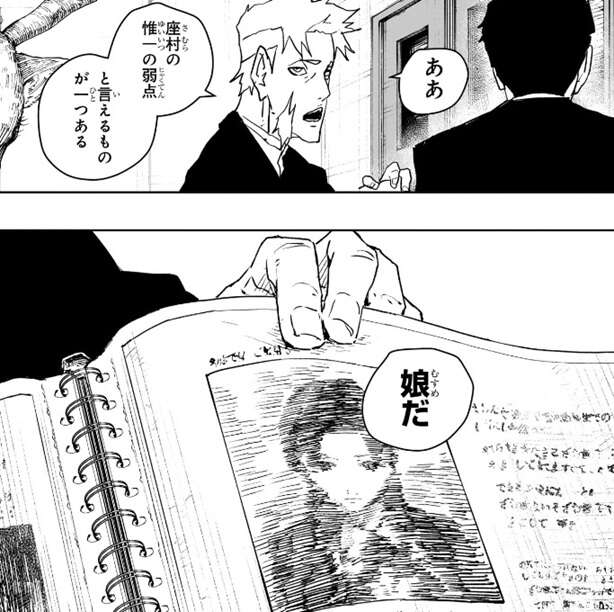 巻墨の隊長はチヒロに奥の手があると言いますが、ここで場面が神奈備の上層部に移り、上層部の一人が座村の唯一の弱点と言えるものが一つある、と話しています。それが座村の娘だそうで、上層部は座村の娘を人質として使いたかったようです。