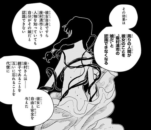 巻墨は座村がチヒロを一度殺したというのを聞いて、座村にとって“死”は大事な人を遠ざける常套手段なのかもと思ったよ、と言います。そして、巻墨が座村の下について一度だけ忍びとしての任務を受けたと言い、その任務というのが彼女の死の偽装だったと明かします。神奈備は三年前から契約者の家族まで保護・監視下に置いていて、“安全のため”という名目で彼らの行動を制限しているそうです。座村は自分のせいで娘がそういう目に遭うのをひどく嫌ったそうで、巻墨は今思えば死の偽装はこうなった時、神奈備に利用されない為、と巻墨は推測します。そして、巻墨は座村の娘は素性を隠して生きている事をチヒロに明かしますが、チヒロは座村の娘を人質にすることに反対します。巻墨の隊長も座村の娘を戦いの場に連れるつもりなんてないと言い、重要なのは人質(そこ)じゃない、と指摘します。