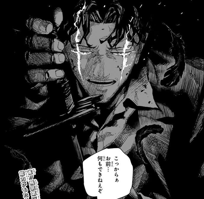 雀を使用すると体の傷の場所に火がつき、傷が治っていきます。その“火”は傷を種(くさ)にして灯るようですが、傷が治る以外の能力の詳細は現時点では不明です。チヒロと昼彦の場所には大量の黒い羽根が迫ってきますが、その大量の黒い羽根の中に座村がいて、活気がいいなぁ糞餓鬼、と昼彦に話しかけます。