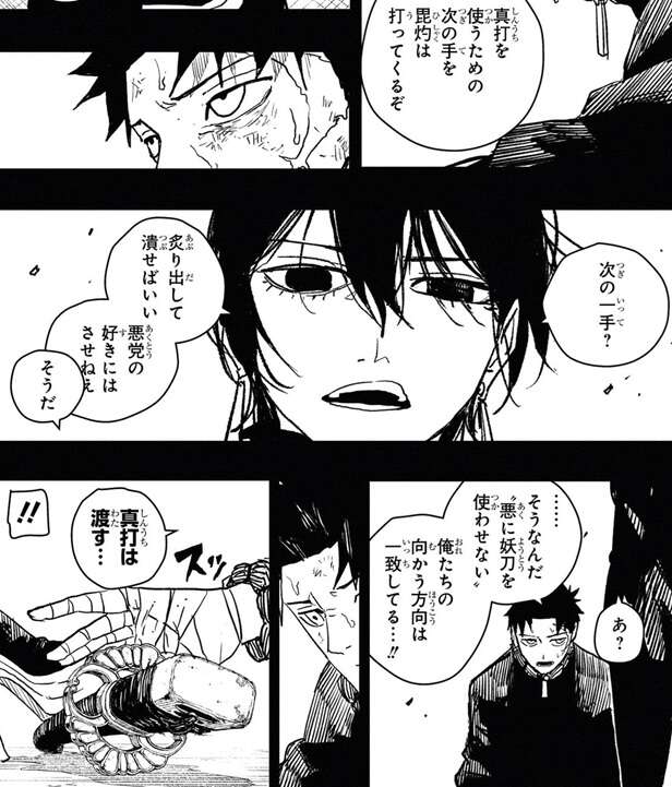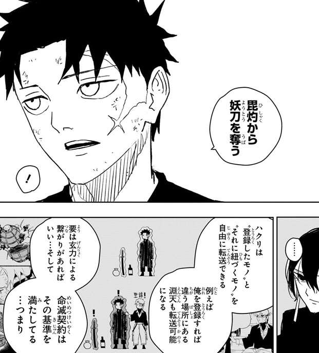 チヒロは緋雪に真打を渡す代わりに、俺を神奈備の戦力に加えるように提案します。その後、チヒロとハクリは病院に入院しますが、チヒロが目を覚ますと病室には柴や緋雪、田福、シャルがいました。柴はチヒロが神奈備に加わる事に反対のようですが、チヒロはハクリの転送能力で毘灼から妖刀を奪う打開策を示します。
