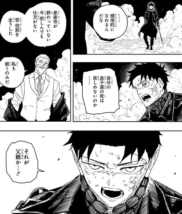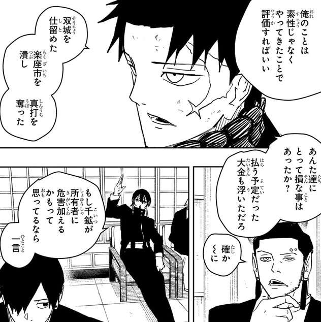 京羅は真打の競りを強行し、さらに地形を変形させて商品の守りを固めます。一方、ハクリは脳が焼き切れそうになっており限界が近く、チヒロのサポートをどこまで続けられるか分かりません。こんな状況でも京羅は観客を煽り楽座市を続けようとします。チヒロは京羅に、自分の息子達の死は悲しめないのかと問い質します。