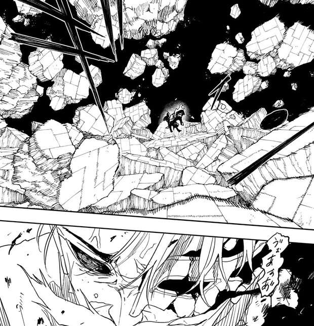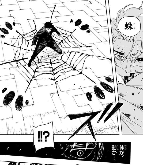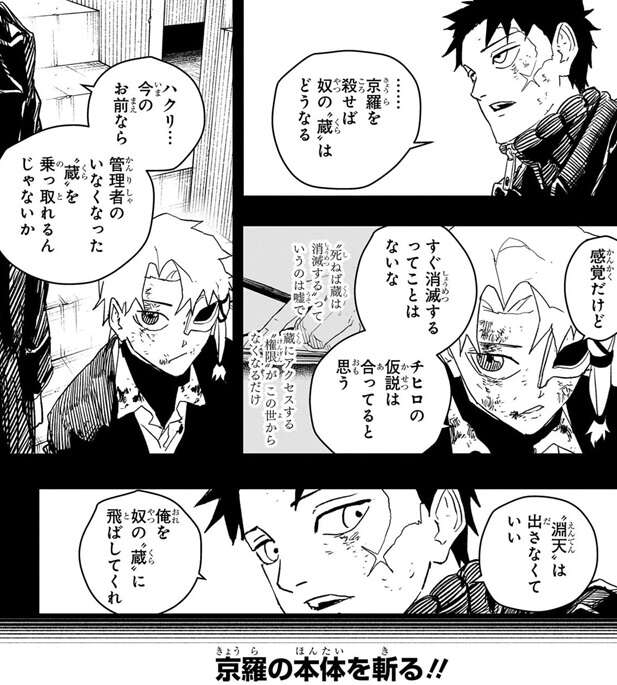 京羅は真打を使うと京羅の頭の中に何かが入り込んできているようで、京羅は真打か、はたまた剣聖か…、と考えた後、どちらかが私を乗っ取る気だな……!!と推測します。しかし、京羅は立っていられないほど致命傷のはずですが、真打を使っている恩恵で京羅は戦闘を継続できます。京羅はチヒロを殺して淵天を奪い、淵天の競りを行おうとしていて、蛛(クモ)でチヒロを拘束し蜻(トンボ)で攻撃します。