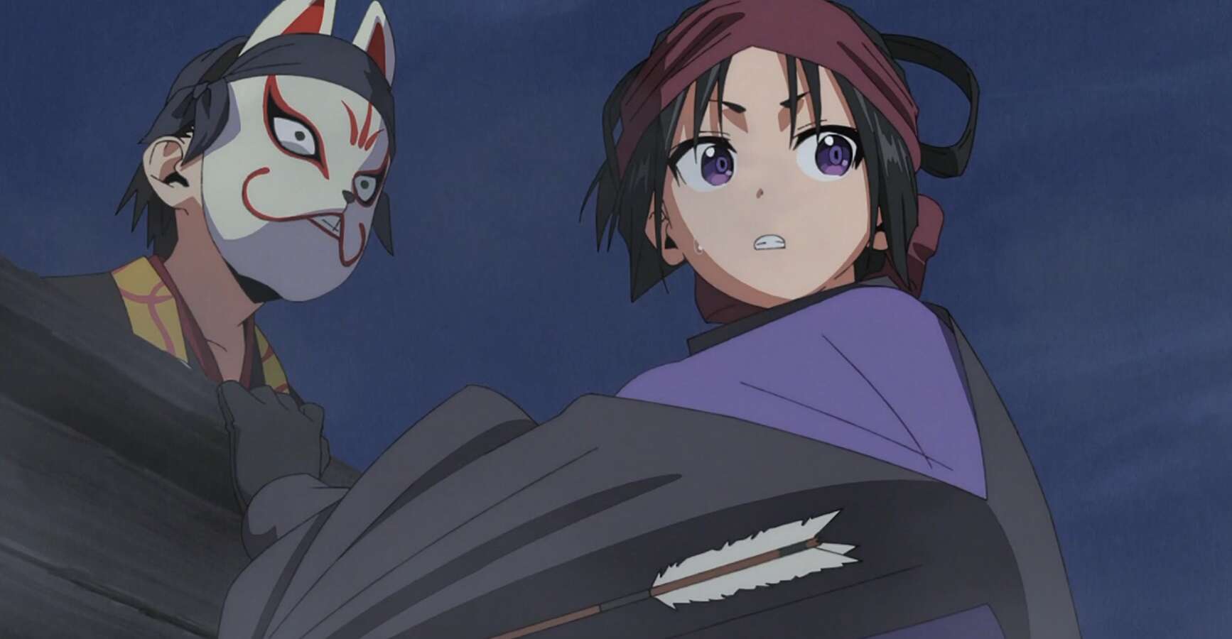 第六回では、綸旨を無事盗んだ玄蕃と時行が市河に見付かってしまい、玄蕃が刀で斬りつけられて、玄蕃を庇った時行が刀傷を負ってしまいます。玄蕃は時行に傷を負わせてしまった事に責任を感じ、追ってきた貞宗と市河に一人で対峙します。貞宗と市河は玄蕃を卑怯な技を使う盗人と侮りますが、玄蕃は忍者の技で二人を翻弄し、その隙に時行を仲間と合流させて逃がします。玄蕃は時行の一途さに触れて損得抜きで仕えたいと思うようになり、国一つの契約で逃若党に加わります。