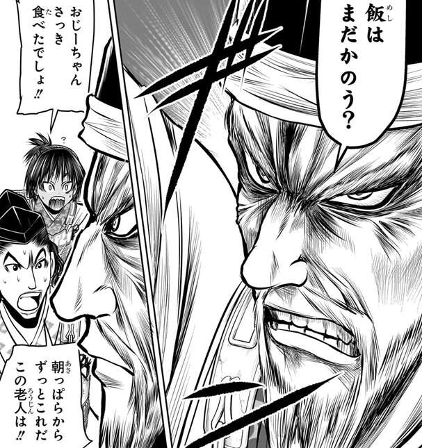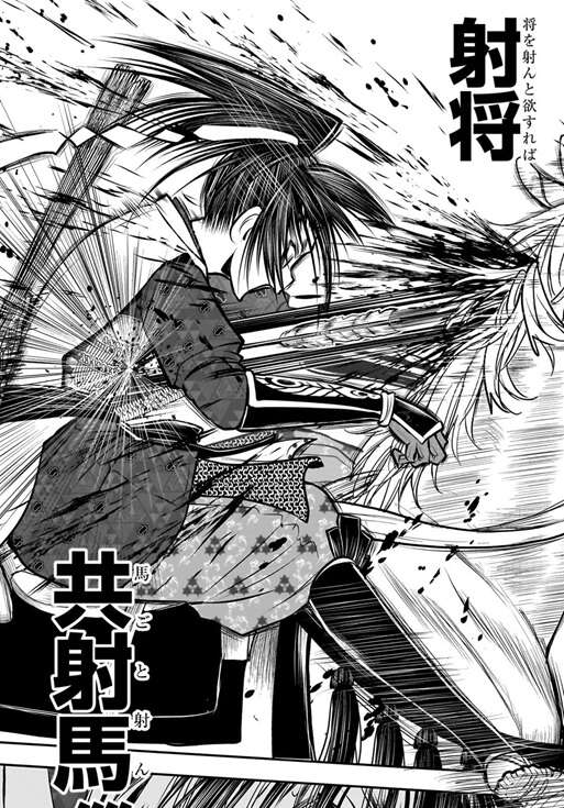 新しい武器「鐵柳」と鍛えた筋力で、弧次郎は長尾と互角以上に渡り合います。その様子を見た上杉は長尾に「九十九型」活性剤を投与し、筋力を大幅に増強します。超筋肉と大太刀で長尾は大振りの一閃を繰り出し、弧次郎を空中へ吹っ飛ばします。一方、自分から弓術を盗もうとする時行に、貞宗は最強の威力を持つ弓技「射将共射馬(将を射んと欲すれば馬ごと射ん)」を時行に放ちます。