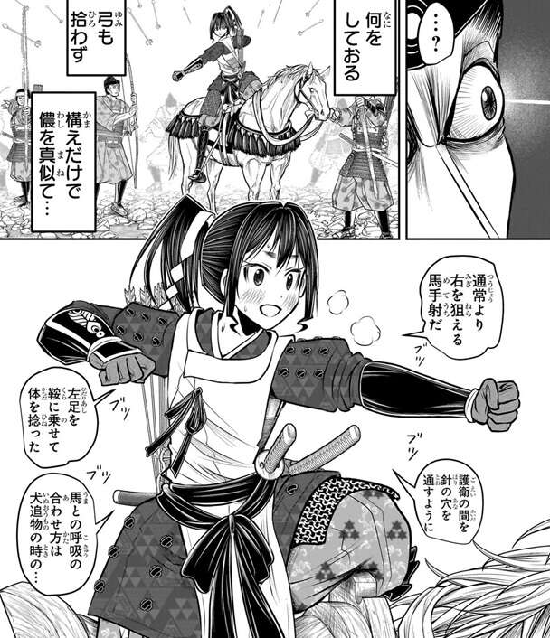 二年ぶりに貞宗と戦う事になった時行は、戦場で小笠原軍を相手にしつつ貞宗の弓術を見て盗もうとします。
