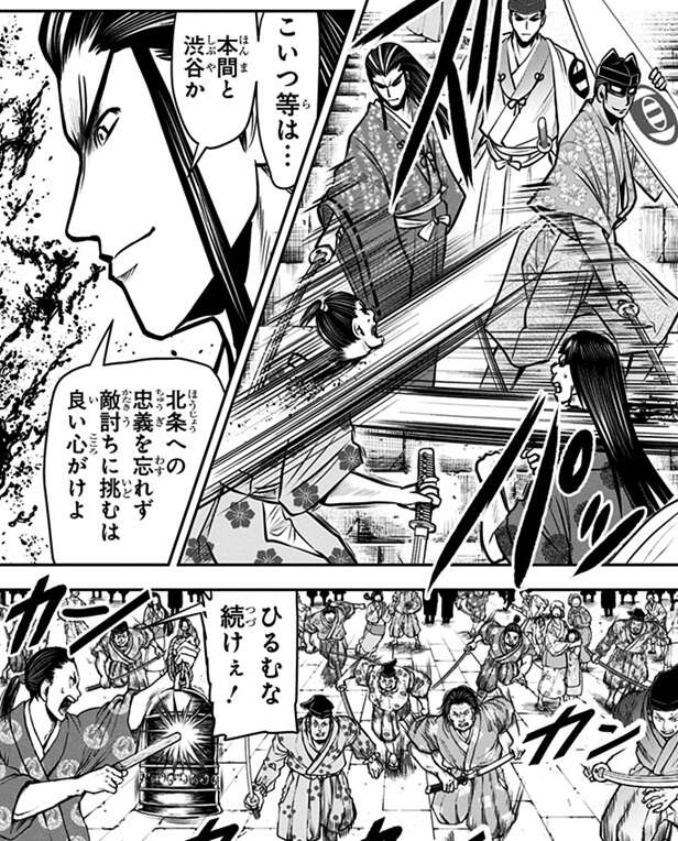 鎌倉を強行偵察してきた雫は、鎌倉は新たに赴任した足利直義と関東庇番によって様子が変貌していたことを諏訪頼重に報告します。また、北条への忠義を忘れていない武将が、鎌倉で足利直義の命を狙って決起しますが、関東庇番の渋川義季、岩松経家などの手によって制圧され、鎌倉は足利の鎌倉に生まれ変わりつつありました。