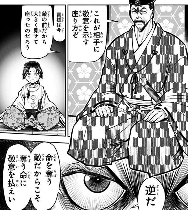 小笠原貞宗に北条一族か重臣の子と怪しまれた時行は、守護館に呼び出されてしまいます。時行は亜也子を連れて守護館へ行き、小笠原貞宗と密室で一対一で対峙します。時行は舐められるわけにはいかない、と自分を大きく見せようとして胡坐をかきますが、小笠原貞宗からは座を正して相手に敬意を示すようにたしなめられます。