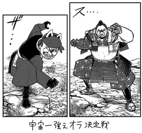 弧次郎と戦った敵武将・和田米丸と、玄蕃が何故か対峙しています。気のせいか和田米丸と玄蕃は某漫画を彷彿とさせる構えをしています…。