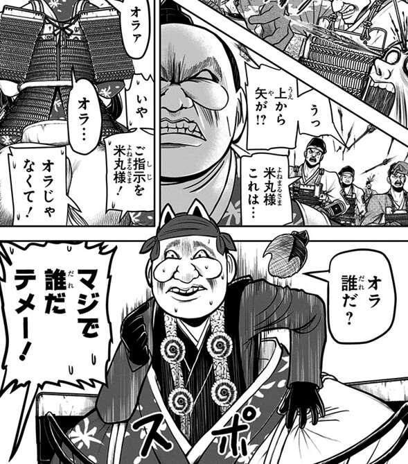 逃若党の副将・弧次郎は敵武将・和田米丸との騎馬戦に挑みますが、腕力差と体重差と相対速度の前に手も足も出ず吹っ飛ばされます。しかし、味方が油断した和田米丸を馬から引きずり下ろし、さらに弧次郎の奮闘もあり見事に和田米丸を討ち取ります。