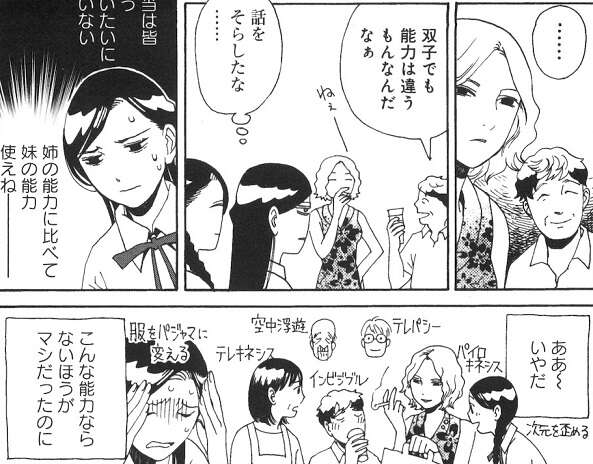 犬谷ありさの家族、犬谷家は超能力を持った一族で、双子の姉 ゆりかは次元を歪ませる能力を持っています。父はテレパシー、母はテレキネシス、叔父はインビジブル、叔母はパイロキネシス、おじいちゃんは空中浮遊の超能力を、それぞれ持っています。そしてありさの能力は、着衣中の服をパジャマに変える能力で、自分の能力が姉に比べて使えない事に悩んでいます。