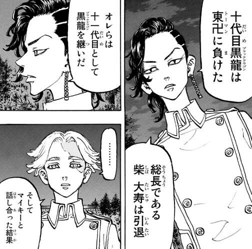 稀咲の裏切りをマイキーに報告していた事は、千冬から教えられますが、それでも一度は隊長クラスまで認められた稀咲は除名に納得できず、マイキーに詰め寄ります。半間からも稀咲が除名になれば、元愛美愛主、元芭流覇羅組が全て抜けることになる、そうなれば東卍は100人にまで萎んでしまうんだぜ?と言われますが、マイキーは構わねぇと答えます。