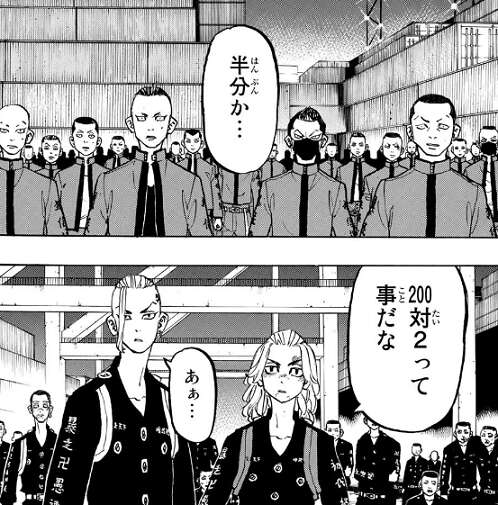 ヒナから、武道のタイムリープの話、ヒナが12年後に死ぬ話をマイキーとドラケンにしたと聞かされ、武道は驚きます。さらにマイキーとドラケンの二人は失意のどん底だったはずなのに、ケンカなんて出来るのかと武道は心配します。しかし、マイキーはまだ天竺は半分ぐらいの200人残っていると聞き、二万人連れてこい!と叫ぶ余裕を見せ、いつものマイキーが戻って来たと武道は安心します。