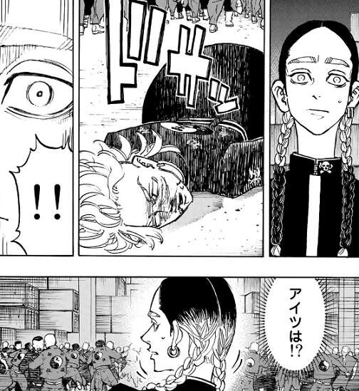 灰谷兄弟、モッチー、さらにムーチョと四人を瞬殺したアングリーのおかげで、一気に天竺は劣勢になってしまいます。勢いづく東卍に、イザナから言われた事を思い出し何とか東卍を止めようとするムーチョは、短刀(ドス)を使ってアングリーを殺そうとします。しかし、鶴蝶にアンタまで天竺に染まるな、と言われムーチョは味方の鶴蝶に倒されてしまいます。