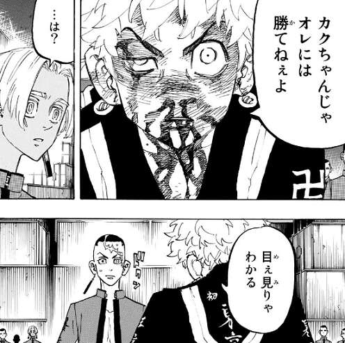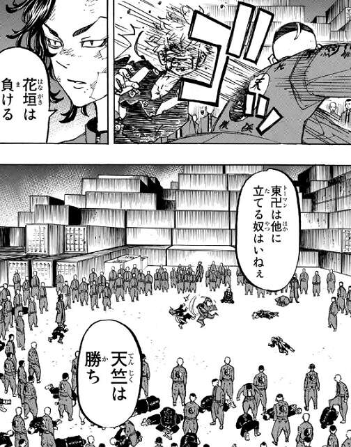 鶴蝶はアングリー、乾、千冬を次々と瞬殺し、武道も一方的に殴り続けて圧倒します。それでも諦めず武道は鶴蝶の前に挑もうとしますが、気付くと東卍で立っている者は武道しかおらず、東卍はもう終わりだとココは言います。それでも立とうとする武道は、千冬は武道にもう止めるように説得します。