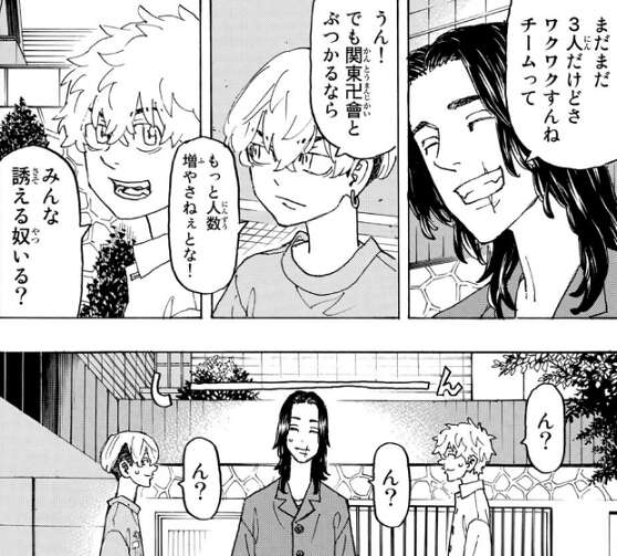 千冬、八戒を仲間に加えてチームメンバーが三人となった武道は、さらに人数を増やそうと考えますが、三人とも思い当たる人物がおらず、勧誘は行き詰ってしまいます。その時、武道はイヌピーを誘うことを思いつき、ドラケンとイヌピーがやっていたバイク屋へと向かいます。