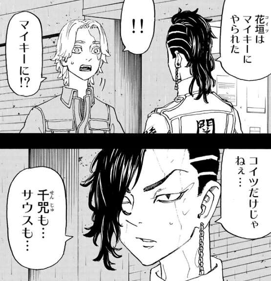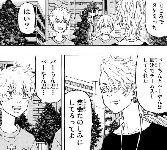 武道のチームに三ツ谷が加わり、さらにパーちんとペーやん、川田兄弟も武道のチームに加入し、メンバーは9人となります。さらに武道はどうしてもチームに加えたいと、千咒に会いに行きます。しかし、千咒は三天戦争以来ふさぎこんでいて、元 梵(ブラフマン)のアジトに武道が会いに行っても、千咒はチームの誘いを断ります。