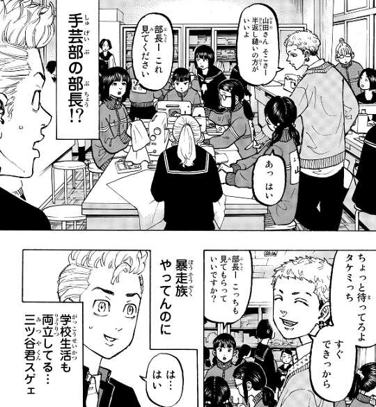 三ツ谷から呼び出された武道は、三ツ谷の中学に行くと同じ中学だと言う林が校門まで迎えに来てくれます。三ツ谷のいる教室まで案内してくれますが、三ツ谷は家庭科室にいて、学校では手芸部の部長をしていました。そして、その場で武道が集会できる予定の特攻服を、三ツ谷は仕立て上げてくれます。