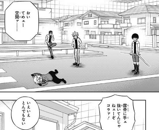 初対面で男と間違えてしまったばかり、ずっとあとまで尾を引いた前例が向こうの世界で空閑にはあり土下座はおおげさではないそうです。弓場も空閑の心掛けに感心し、詫びのついでに帯島に稽古をつけてやってくれと言います。帯島も稽古をつけてもらえれば嬉しいと言い、空閑は帯島と戦いますが露骨に手を抜きます。