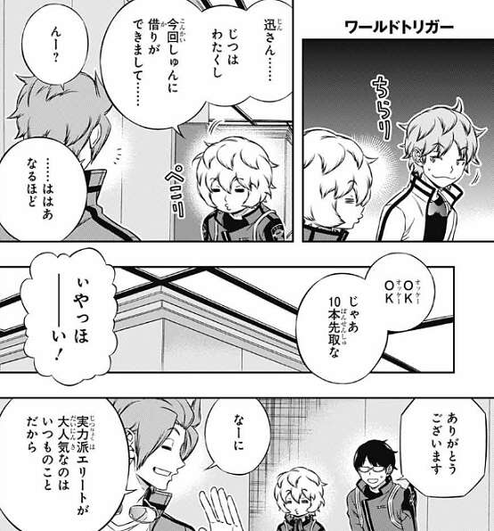 前回の記事はこちらです。緑川と一緒に、空閑は弓場隊の隊室へ向かいます。