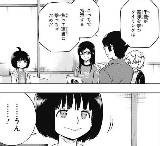 三雲が迷っていると、空閑は雨取が撃てると思っているならやってみたらいいと思う、決めるのは雨取と隊長の三雲だと言います。三雲は暫く考えた後、この作戦で行くと言い、ただし雨取が実弾を撃つタイミングはこっちで指示をするので焦って適当に撃っちゃだめだと付け加えます。そして雨取を守る役はトリオン能力的に自分になるだろうと、ヒュース自身が考えていて、ただしヒュースと雨取が合流できない可能性も考えて「別案」が必要になるという話になります。