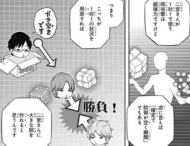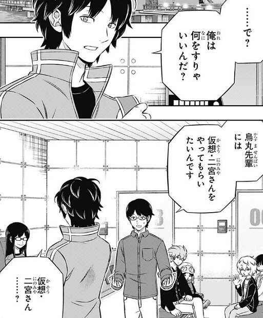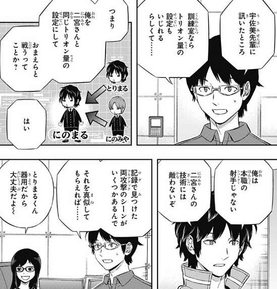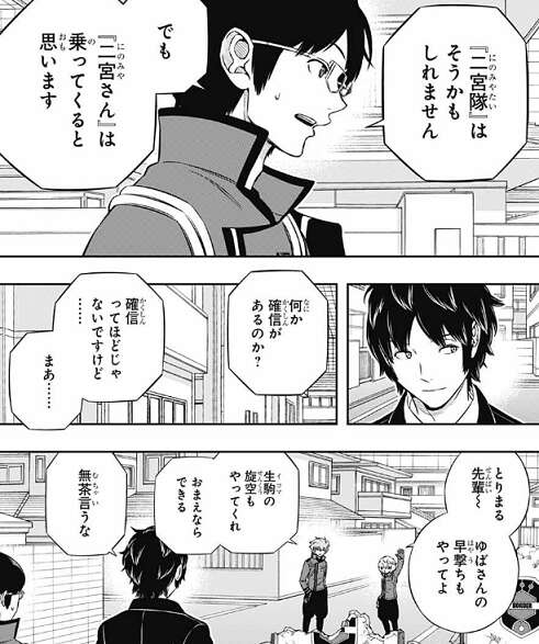 この訓練は、その隙が出来るタイミングを覚え、1対1を長引かせて二宮の隙を持続させる訓練になり、「あえて使わせてその隙を突く」ための対策になります。烏丸は三雲達の狙いは理解しつつも、二宮が1対1の誘いに乗ってこないのではと言います。二宮隊は既に単独1位で無理をする必要はなく、烏丸の言う通りこちらの誘いには簡単に乗りそうにありません。しかし二宮は乗ってくると思うと、三雲は自信があるような言い方をします。そこに空閑とヒュースからさらに無茶な要求が烏丸にとんできます。ヒュースの物言いが、相変わらず偉そうな感じです。