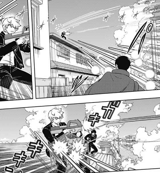 二宮は強化追尾弾(ホーネット)で迎撃し爆撃を何とか防ぐ二宮隊、そしてその隙に弓場が辻を狙撃し狙います。