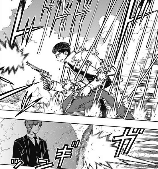 弓場の間合いなら早撃ちもあり有利かと思った瞬間、上から弾丸が降ってきて弓場の戦闘体を撃ち抜きます。一方、弓場の弾丸は二宮のシールドに防がれてしまいます。