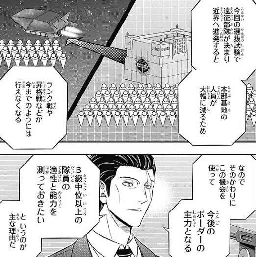 そして、ボーダー本部指令の城戸から試験の説明が行われます。今回の遠征選抜試験が決まりネイバーフットへ進発すると、本部基地の人員が大幅に減りランク戦や昇格戦が今までのように行われなくなるそうです。そこで、今後のボーダーの主力となるB級中位以上の隊員の適正と能力を測っておきたいようです。