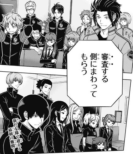 さらに、第1試験ではA級隊員が審査する側にまわる、という説明が忍田からあります。A級の人たちが審査官と聞き、三雲は驚きます。