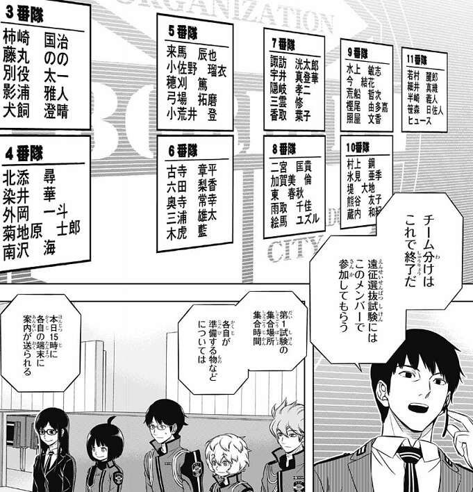 各隊の隊長全員が第3プールの指名を終え、チーム分けが終了します。第1試験の集合場所、集合時間、各自が準備する物などについては、15時に各端末に案内が送られる、と忍田から説明があります。