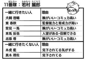 独特なセンスの持ち主の王子ですが、生駒、加古、佐伯、ヒュースの理由が「おもしろい」 か 「おもしろそう」、ヒュースをおもしろそうと評価する辺りのセンスは流石です。そして雨取の理由が「トリオンにロマンがある」、トリオンにロマンを感じているそうです。一緒に行きたくない人は、三輪で理由が「冗談が通じなさそう」です。三輪に冗談言ったら怒られそうですもんね。