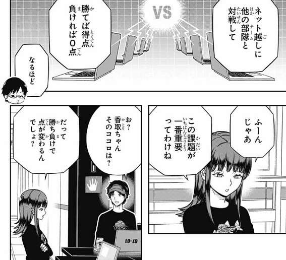 共通課題と分担課題の多さに香取が、7日間ずっと夏休みのラスト1日みたいなもんじゃん、と文句を言います。別に遠征目指していないし、と香取が言うと、遠征希望じゃないんですね、と三雲が笑顔で香取に質問します。すると、チームでなら行くわよ、チームでなら、とジロッと三雲を睨みながら香取は答えます。チームで選ばれる権利があるのは、B級ではランク戦を勝ち抜いた二宮隊と玉狛だけなので、チームで選ばれる権利のない香取は一人で行く気になんない、と言います。しかし、お前は選ばれないと諏訪から突っ込みが入り、今度は可能性あるでしょ、と香取は遠征に行きたいような言い方をします。