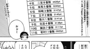 そして、トップを独走中の水上9番隊は照屋が、自分のチームの点数に疑問を持ち始めます。2位以下にあまりに点差をつけて独走しているので、いくらなんでもおかしいと感じたようです。水上は戦闘シミュの事をチームメイトに打ち明けるのでしょうか?