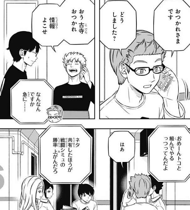 諏訪は古寺に連絡すると、いきなり挨拶の後に情報をよこせ、と切り出します。古寺6番隊と組んでやる、と諏訪は言い、ネタを共有したほうが戦闘シミュの勝率 上がんだろ、と諏訪は古寺6番隊と諏訪7番隊が組むメリットを説明し、情報をよこすように提案します。突然の諏訪からの提案に古寺は戸惑い、順位で勝っているうちのチームにはメリットがないですよね?と、諏訪の提案に古寺は反論します。