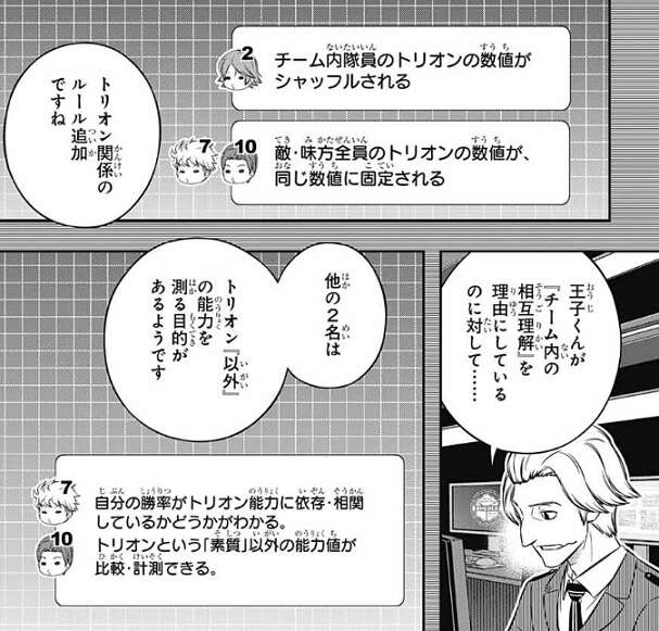 他にはトリオン関係のルール追加のアイデアもあります。チーム内のトリオンの数値がシャッフルされる案や、敵・味方全員のトリオンの数値が同じ数値に固定される、といったものです。トリオンが低い人間に下駄をはかせた結果、変に勘違いされるのでは?と、鬼怒田が意見を言います。