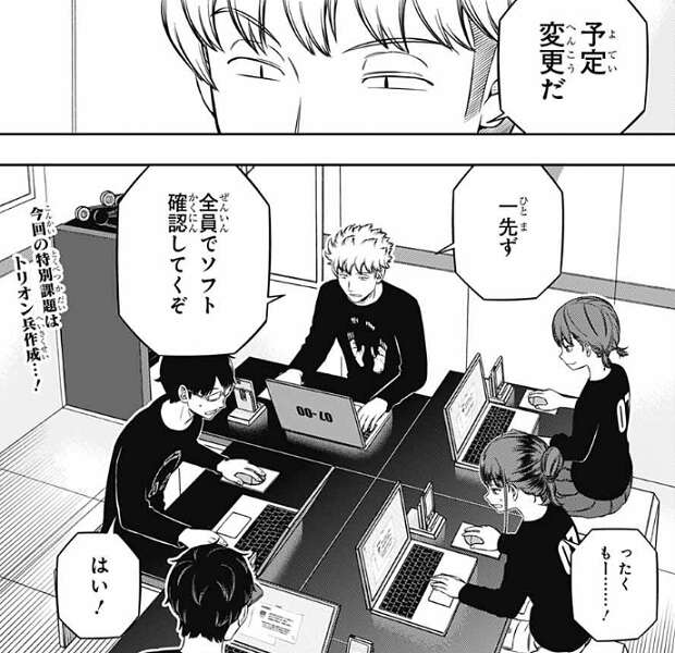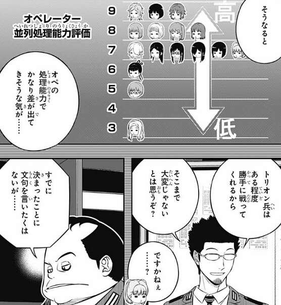 オペレーターが操作するのだと、処理能力でかなり差が出て来そうなことを武富は懸念します。しかし、トリオン兵はある程度勝手に戦ってくれるから、そこまで大変じゃないと言う意見が林藤から出ます。鬼怒田は、既に決まったことに文句は言いたくないが、トリオン兵を扱う部門と、トリガーを扱う正隊員は分けた方がいい、と意見を言います。トリオン兵に頼る戦い方を覚えてしまったら、B級中位以上と下位の差が開くことになる、と鬼怒田は懸念します。