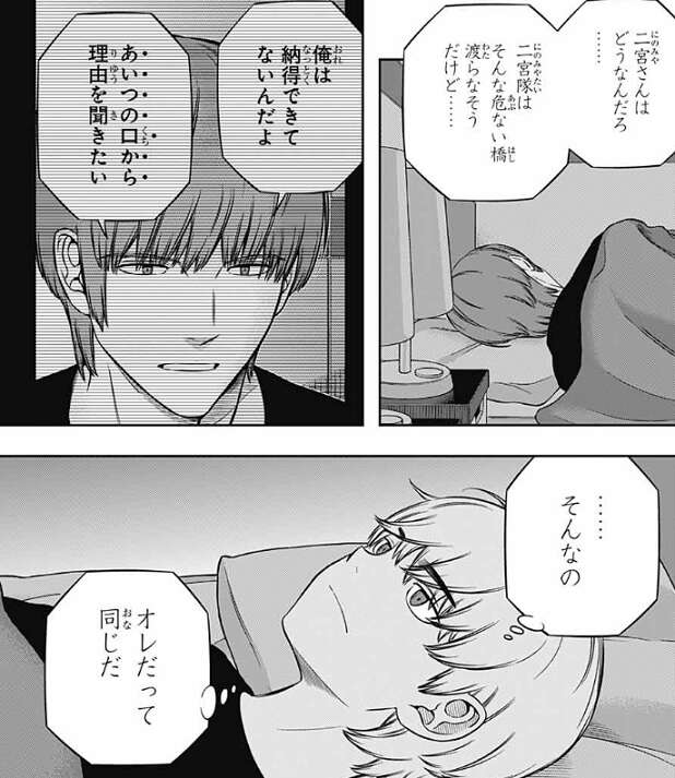 絵馬に鳩原失踪の真相を伝えた二宮は、ちゃんと自力で試験を突破するように念を押します。上層部は鳩原の真似をして、ネイバーフッドに密航する人間が出ないか懸念しています。そんな真似をしないように二宮は念を押しますが、絵馬はそんなことするわけないと言おうとします。