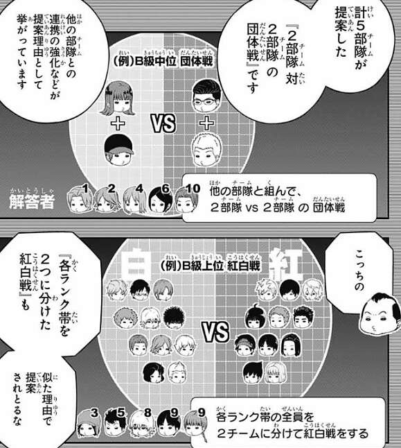 その一昨日の特別課題③のあった日、各チームの解答が出揃った後、上層部とランク戦実況解説システム運営主任の武富が集まって解答を確認していました。『B級ランク戦の新しいルールを考えよ』に対しての解答で、まずは多数派の解答から見ていきます。一番多かったのは、『2チーム対2チームの団体戦』を計5チームが提案したようです。『各ランク帯を2チームに分けた紅白戦』も計5チームから提案されています。